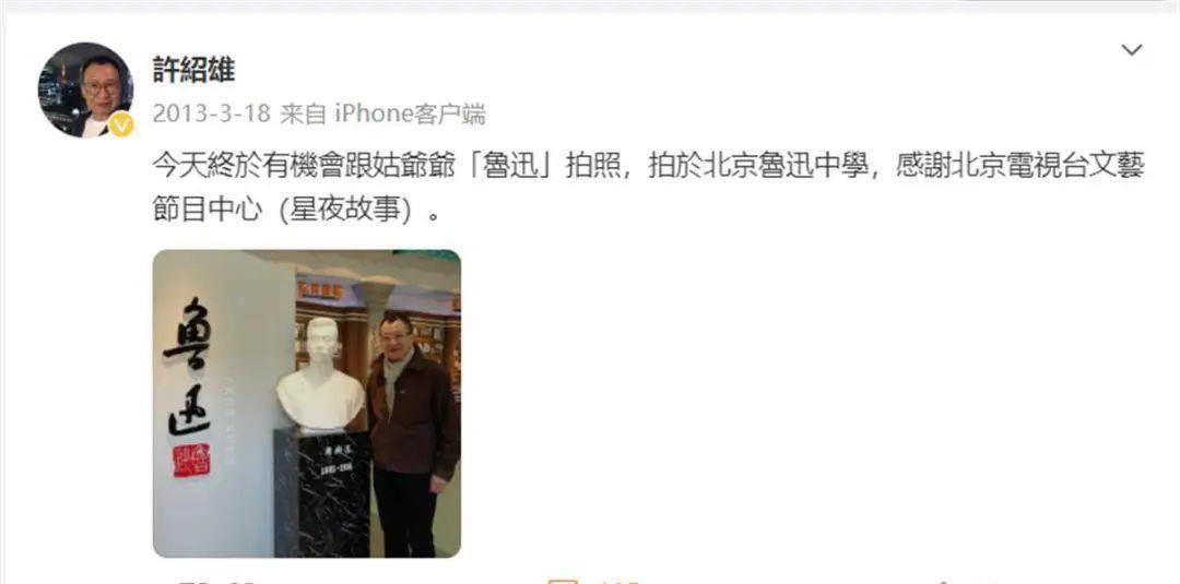 (图源:许绍雄微博)虽然许绍雄自幼家境富裕,妻子也出自名门望族,但他一直坚持工作,认真演戏,并表示不愿退休。此前报道据广州日报,3月,香港老戏骨许绍雄携妻女回到广东顺德,参观妻子娘家的家族产业——佛山顺德清晖园。清晖园是全国重点文物保护单位,AAAA级旅游景区,与佛山梁园、番禺余荫山房、东莞可园并称广东四大名园。清晖园蕴藏着深厚文化底蕴,原为明万历三十五年(1607年)状元黄士俊府邸,清乾隆年间为进士龙应时购得,其后,复经龙家一门数代精心营建,格局始臻定型。20世纪90年代末,顺德政府对清晖园投入大量人力、物力、财力扩复旧制,重现古园风采。现今清晖园的面积达到2.25万平方米。许绍雄在社交媒体上发文表示,2011年,龙氏后人向政府捐献清晖园。公开资料显示,许绍雄1948年11月4日出生于中国香港,祖籍广东汕头。1972年,他加入第1期无线电视艺员训练班,他是TVB第一个驾驶奔驰上班的艺员,还有“Benz雄”的昵称。许绍雄在众多TVB电视剧中饰演配角,甘当绿叶,虽然他长得不帅气,戏份也不多,但他风趣幽默、轻松自然的表演总是让人马上就记住了他。他是《新扎师妹》中的警督,是《河东狮吼》 里的苏永邦,标志性的黑框眼镜,许绍雄亲和力十足,好像就是你的亲叔叔亲同事一样,有时是老油条,有时是有点滑稽的公司主管,会让你对着屏幕露出会心一笑。近年来,《使徒行者》中“欢喜哥”的角色使他又火了一把。这样游走于黑白两道的人物,许绍雄演起来游刃有余,深受观众喜爱。尽管一辈子都在当“绿叶”,许绍雄却是名门之后。他的父亲开玉石店,其太公许应骙是慈禧太后的干儿子,官至礼部尚书,闽浙总督,官拜一品,获赐可在紫禁城骑马。据新民周刊报道,许绍雄的叔公许崇智是参与创立黄埔军校的粤军总司令,是蒋介石掌权之前国民党早期主要军事领导人之一。1925年3月,许崇智被蒋介石借廖仲恺遇刺案设计排挤出国民党领导层。许绍雄父亲的姑姑正是鲁迅的夫人许广平,因此许广平是许绍雄的姑奶奶,鲁迅是他的姑爷爷。极目新闻记者注意到,2013年3月18日,许绍雄曾在社交平台上发文:“今天终于有机会跟姑爷爷「鲁迅」拍照,拍于北京鲁迅中学。”另据新民周刊2021年的报道,许绍雄还曾在个人社交账号上晒出一张与鲁迅长孙周令飞的聚会照,他亲切地喊对方为表弟。